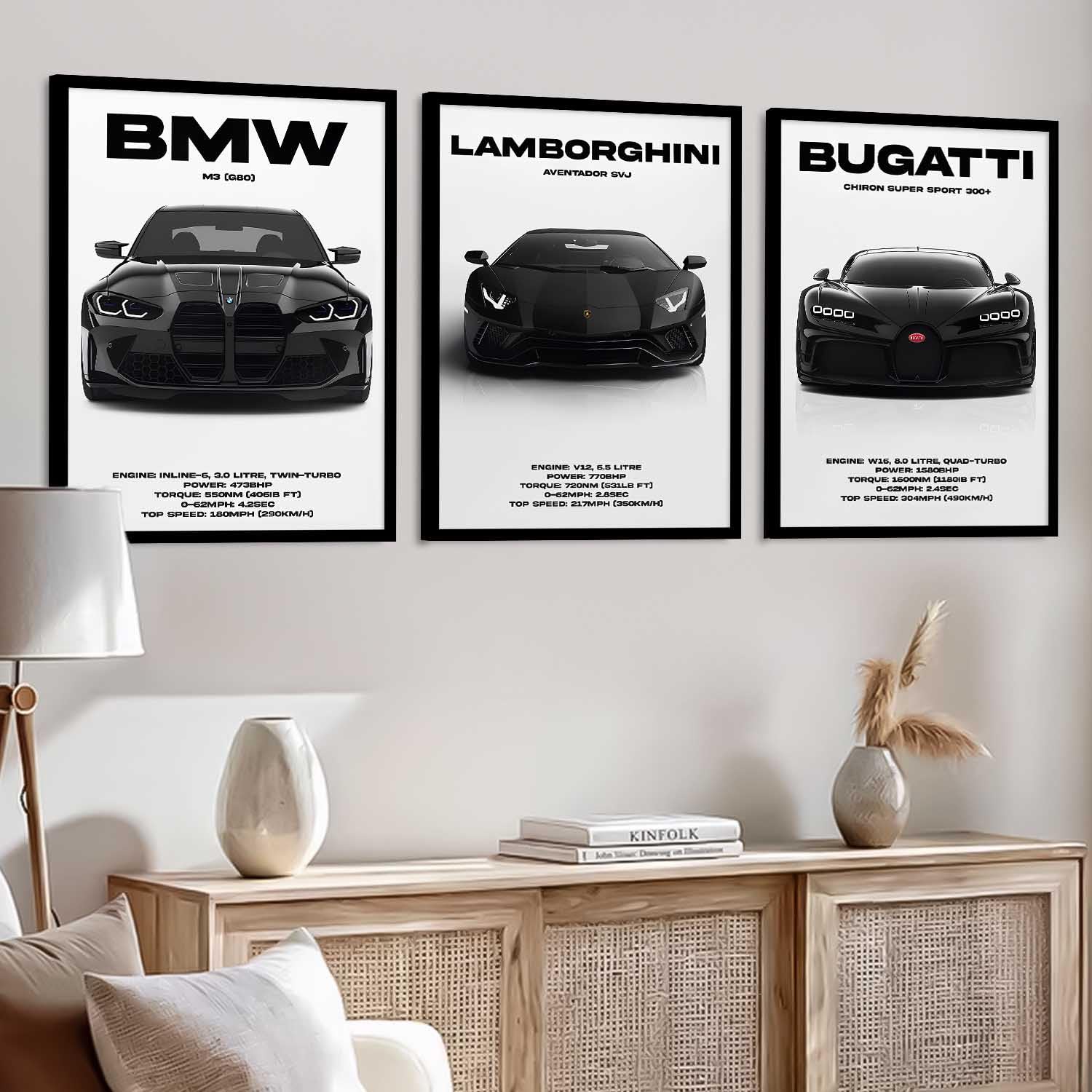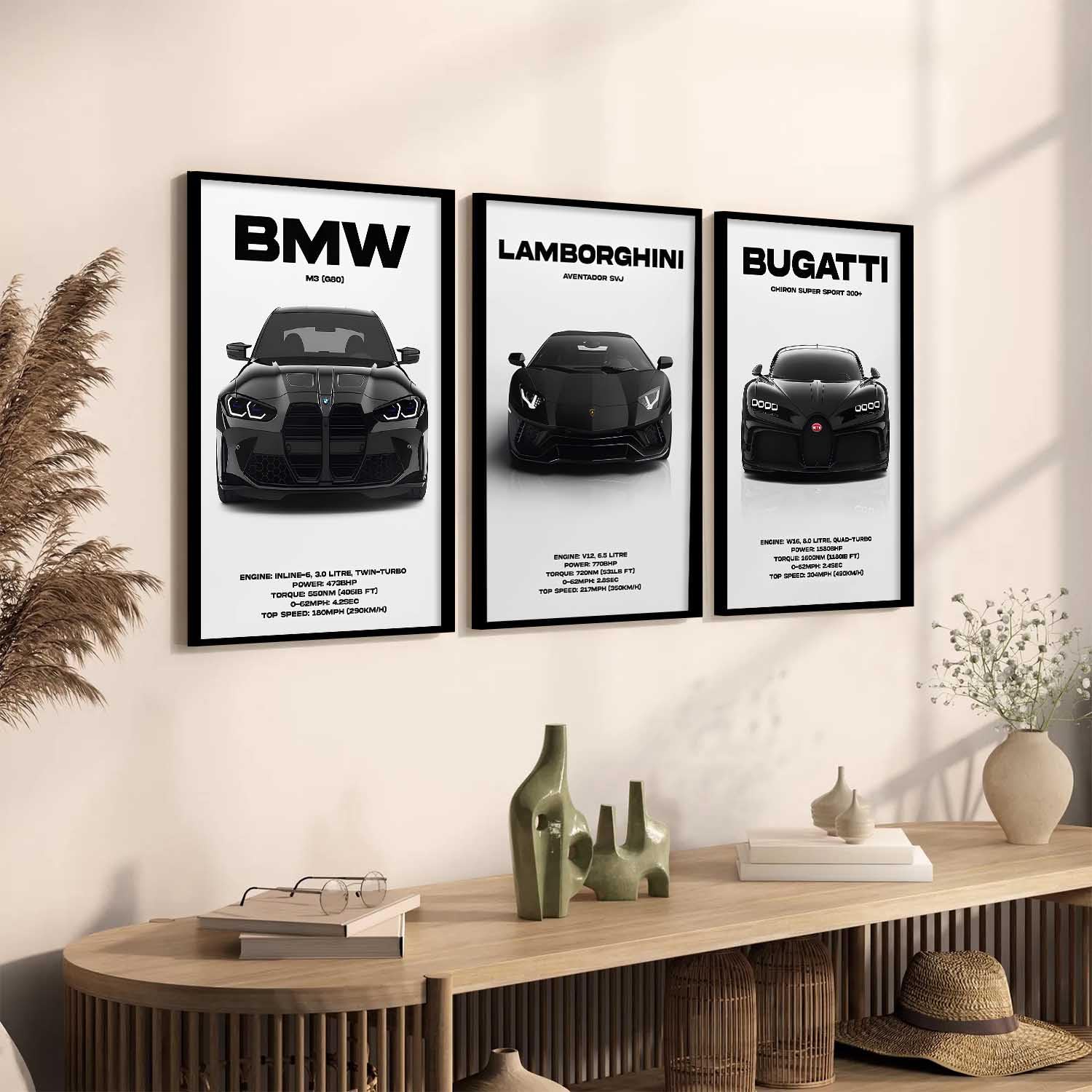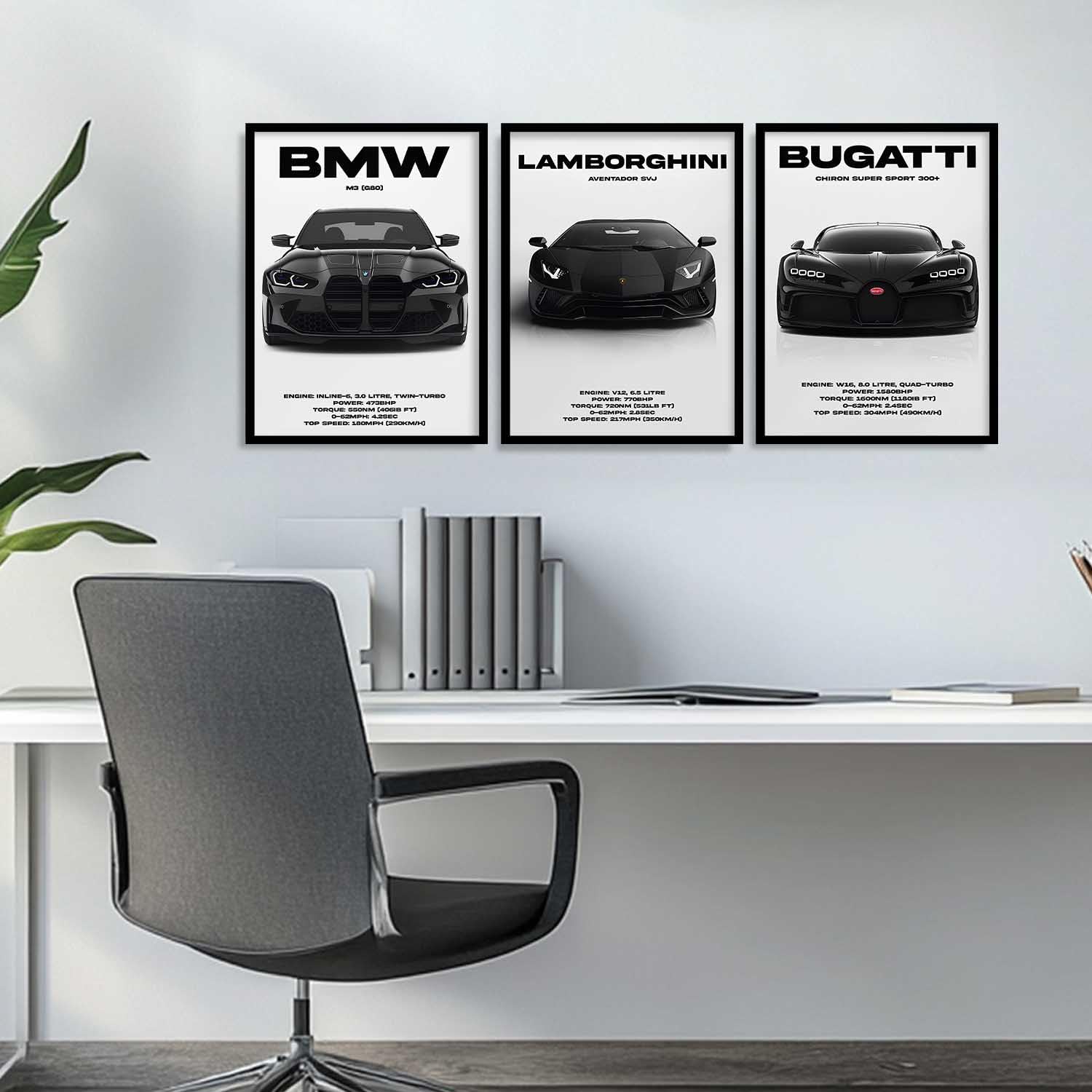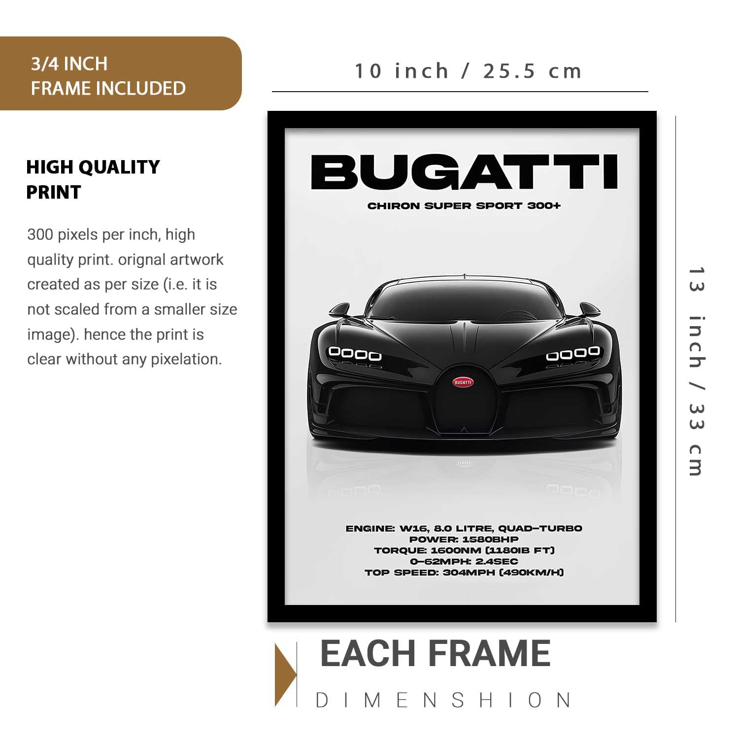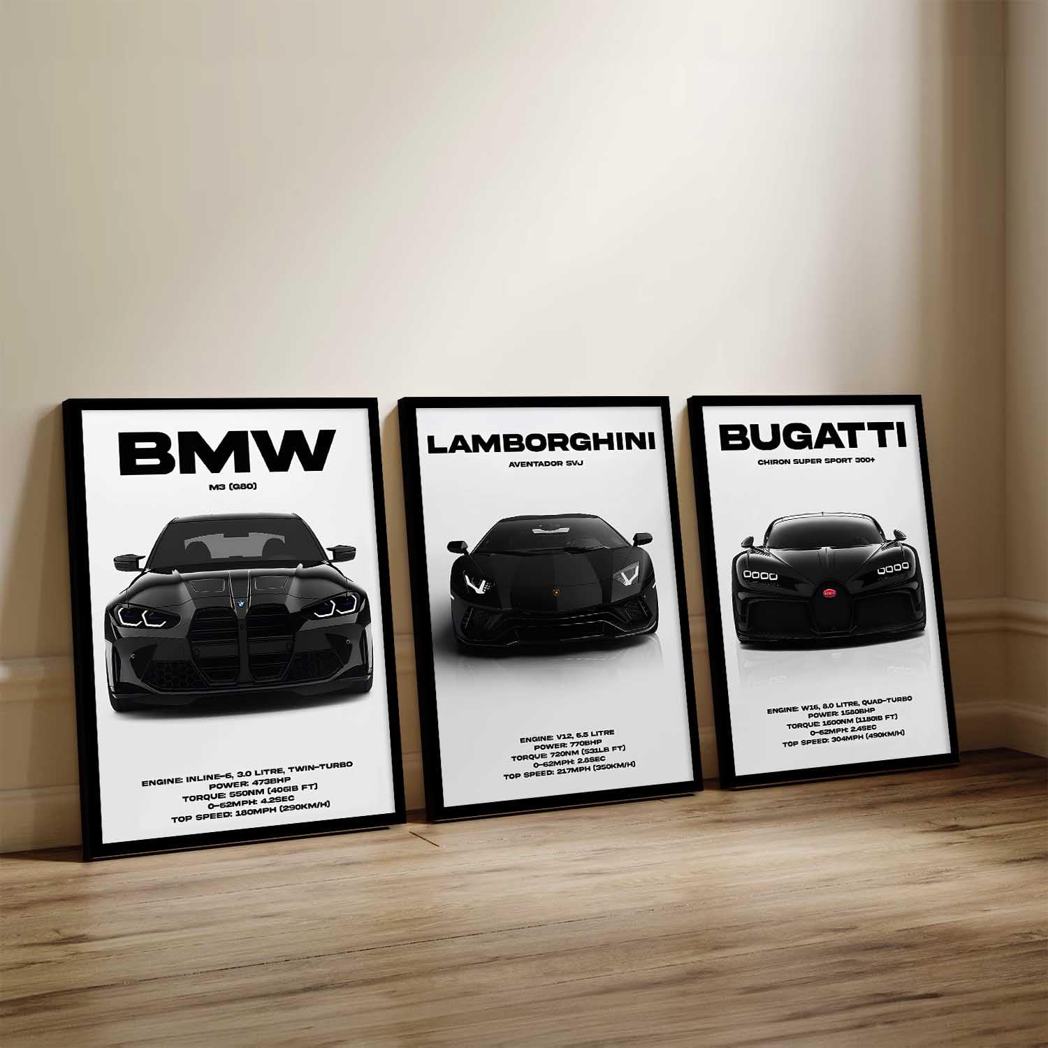 • Frame Details: The premium quality matte-finished black synthetic wood used to make these awesome sports car wall frame posters include an adjustable hook on the back and a clear, unbreakable acrylic sheet in front.